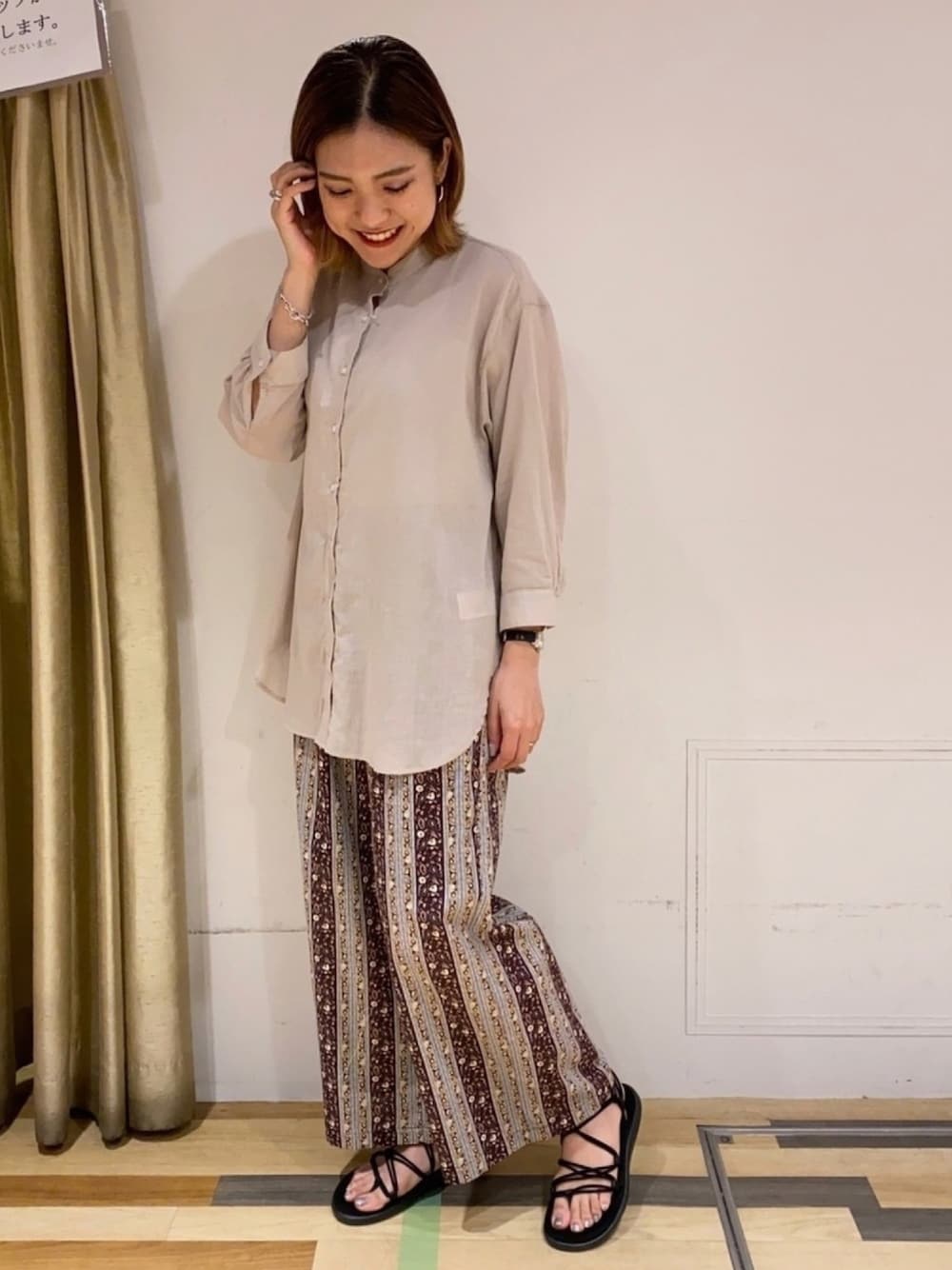 夏のベージュコーデ☕️ 大人気のバンドカラーシャツ、 夏バージョンで登場しました! 透け感たっぷりで、トレンド感満載です💓 ボトムスは、夏の定番 エスニック柄です🇹🇭🐘 色・柄が豊富にあるので、 お気に入りの1着を見つけて下さい😉✨