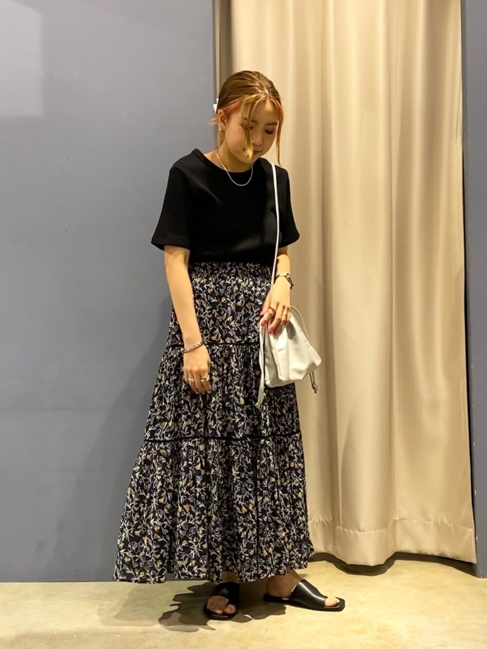 大人の花柄コーデ *トップス エジプト綿のシンプルTシャツ。 シルクのような艶のある素材で、 洗濯しても毛羽立ちづらいという 高機能なアイテムです。 *ボトムス 夏らしい、涼しげな印象のスカート。 トレンドのティアードデザインで、 可愛らしい夏コーデになります☺︎ カラーバリエーション豊富なので、 様々なコーデに活躍します♪