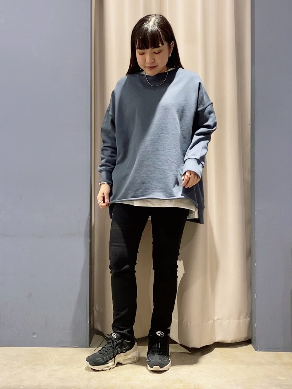 シンプルレイヤードコーデ *トップス シンプルなデザインのスウェット。 裾が切りっぱなしなので、 シンプルながらもトレンド感があります。 腰回りまでしっかりカバーしてくれるので、 パンツと相性抜群です◎ *デニム アメホリ1番人気のスキニーデニム。 脚が長く見えるように設計されており、 ストレッチ性も抜群です!