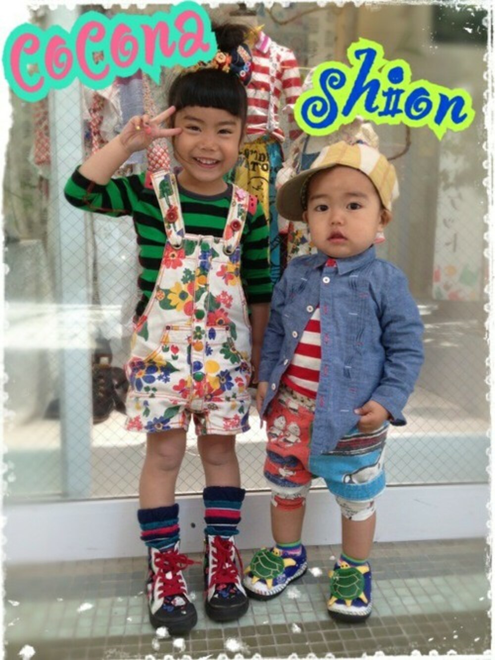 model★cocona & shion おそろコーデでパチリ☆ スイカとリンゴの七分袖Tシャツを揃えて、 お姉ちゃんは花柄のショートオールで可愛らしく♡ 弟くんはスヌーピーのハーフパンツで元気に♪ お出掛け楽しいね(*^_^*)