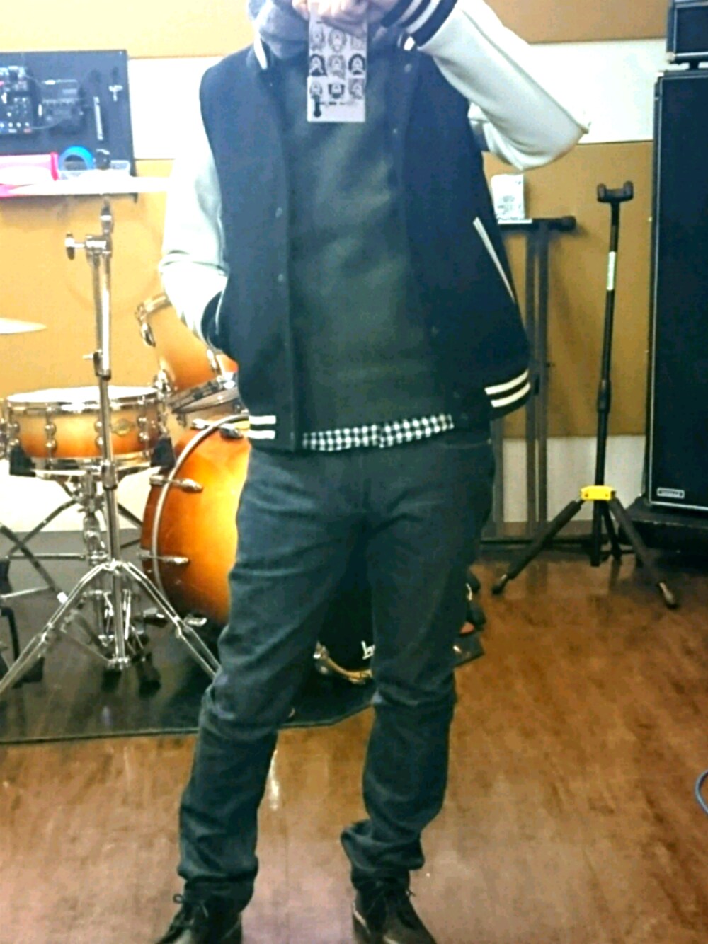 スタジオ練習は動きやすい服装で。 スタジャンにマーチンで軽くなりすぎすです。