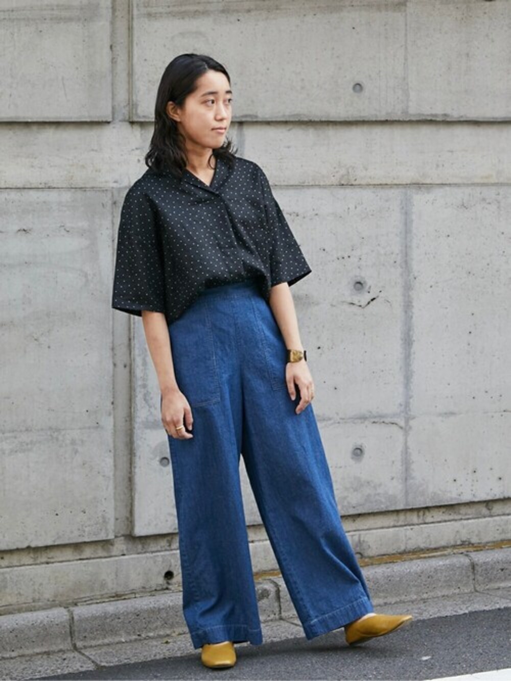開襟シャツとさりげないセーラーカラーが可愛いブラウスを ボトムにタックインしました。 ドット柄は幼くなりがちですが 小さなドット柄は大人に着こなしたい方におすすめです。 長めな5部袖丈なので腕周りをカバーできるのも嬉しいポイントです。