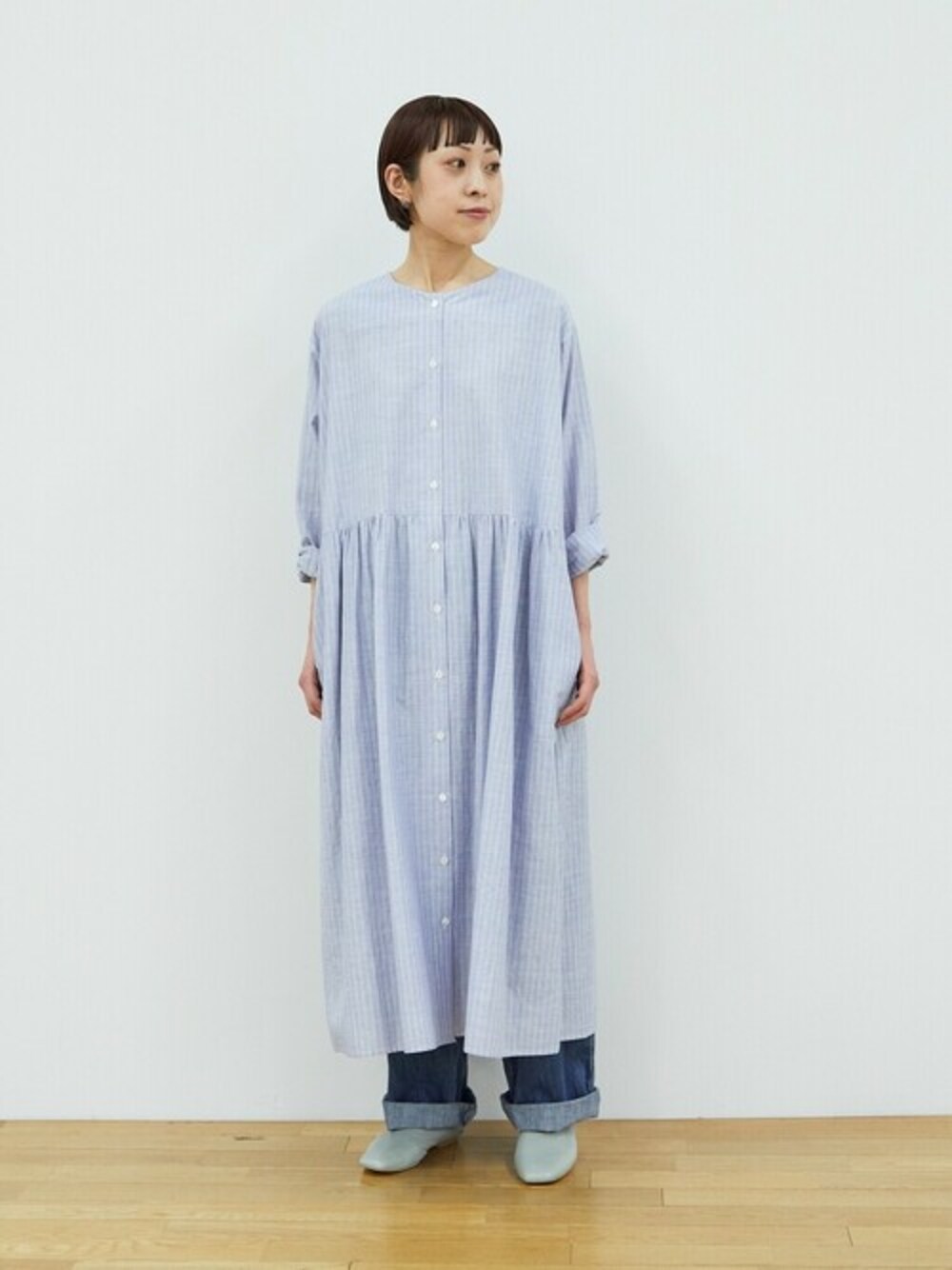 ナチュラルで爽やかなワンピースは 綿麻のダンガリー素材で着心地も抜かりありません。 前後着用可能なので、雰囲気を変えて楽しめるアイテムです。 デニムを挟むと少し甘さが抑えられ、ラフな印象に様変わりします。