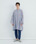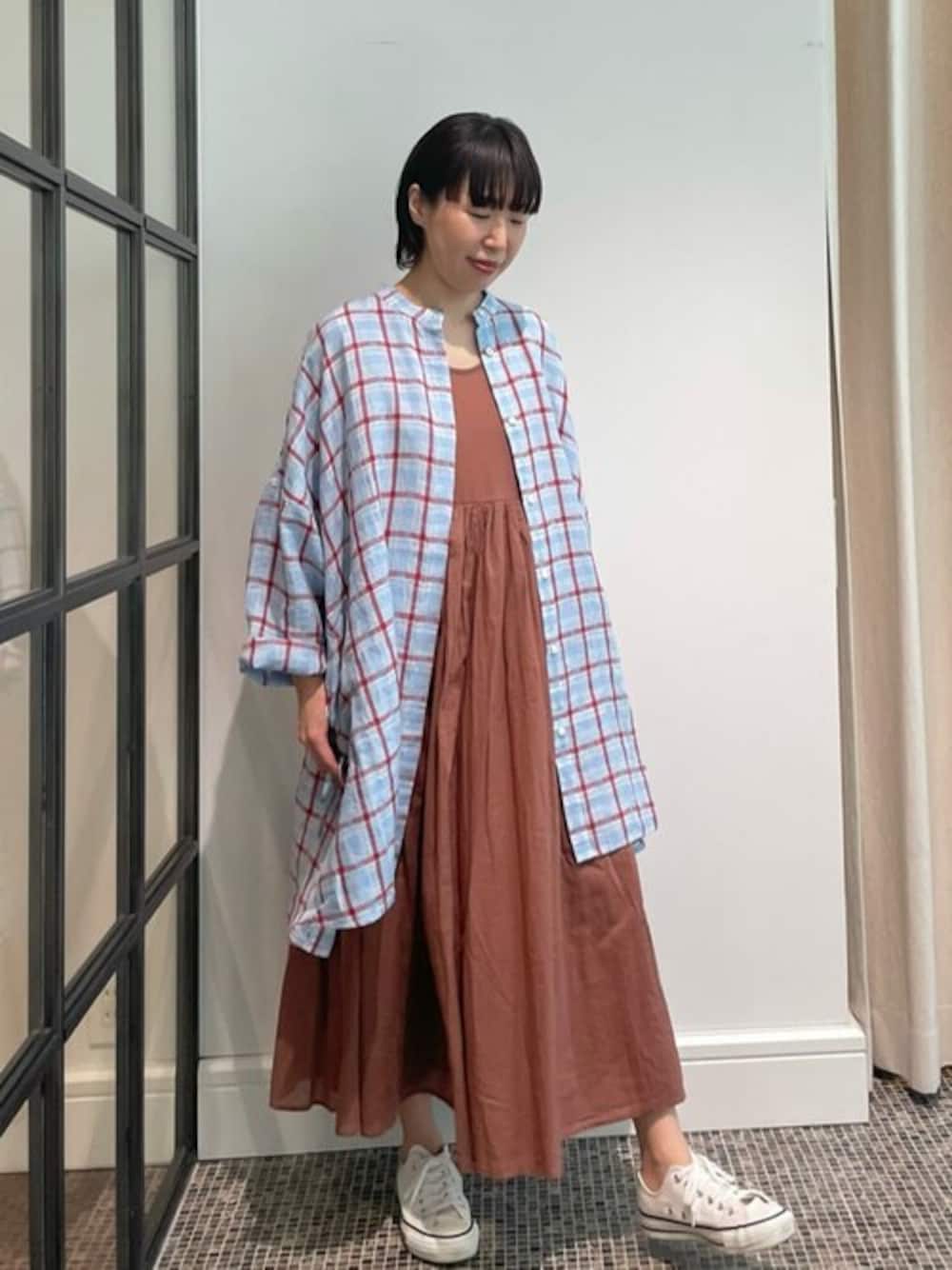 インパクトのあるチェックシャツに、定番のノースリーブワンピースの新色を合わせて、リラックス気分。 色合わせがお気に入りです♪