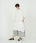 カットソーと布帛切り替えがポイントのワンピースにチュニック丈のシャツワンピースを羽織りとして合わせました。 軽いガーゼ素材で夏の暑い時期まで着られるアイテムです。