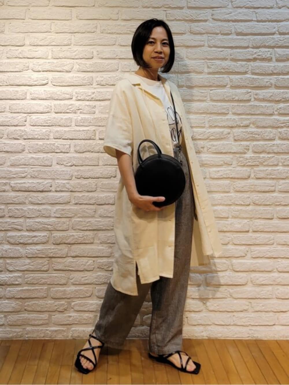 白とロゴT。 メンズライクな開襟チュニックシャツを羽織りで着用。 ボトムを選ばない丈バランスは強い味方。 アップデートしたテーパードリネンパンツも今シーズンのイチオシ!