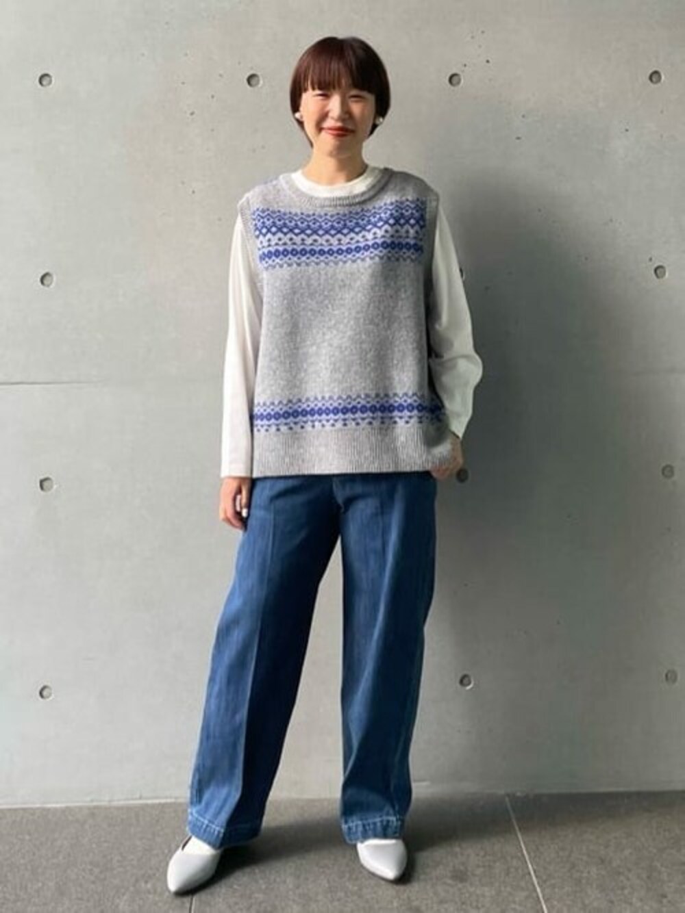 スキーセーターをイメージした秋冬らしいニットベストを、明るめデニムでカジュアルコーデ。 爽やかさの中に、少しレトロな雰囲気を意識。 耳元はパール、足元はパンプスで、大人レディな外しもポイントです♪