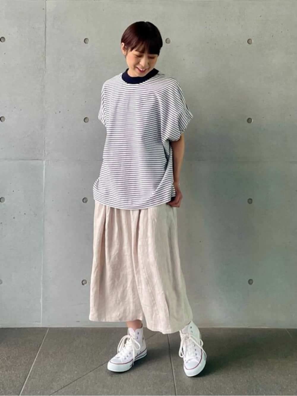 コンジェ定番アイテムコーディネート✨ カノコブラウスとワイドサルエル、毎年人気のシリーズです! 新柄のボーダー、新色のベージュで爽やかにまとめました🍀