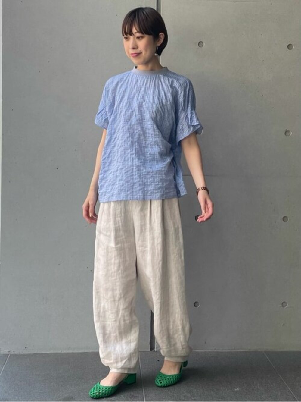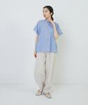 毎年大人気のシャーリングTブラウス✨ グレーのリブ襟×ブルーチェックの合わせがとっても涼やか! まだgetされていない方は是非チェックしてみてください♪ ※テーパードリネンイージーパンツはモデル丈を着用しています。