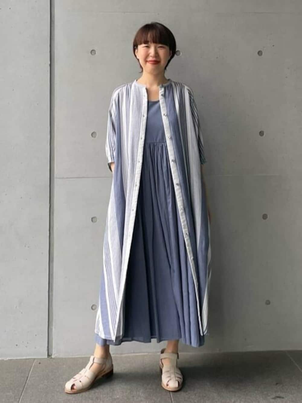 夏のリラックスしたワンピースコーデ。 綿ガーゼの肌心地の良さは暑い夏にピッタリ! コンジェらしいマルチストライプがお気に入り♪