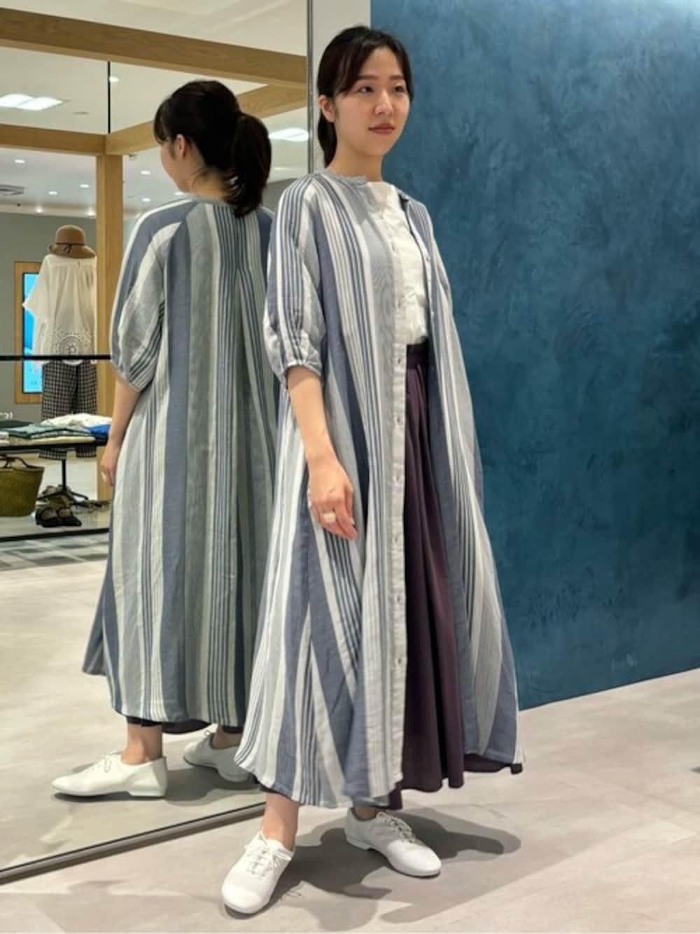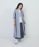 ガーゼ素材が心地よい前開きワンピースを、羽織りで合わせてコーディネートしました。 爽やかなストライプ柄がコーディネートのアクセントになります!