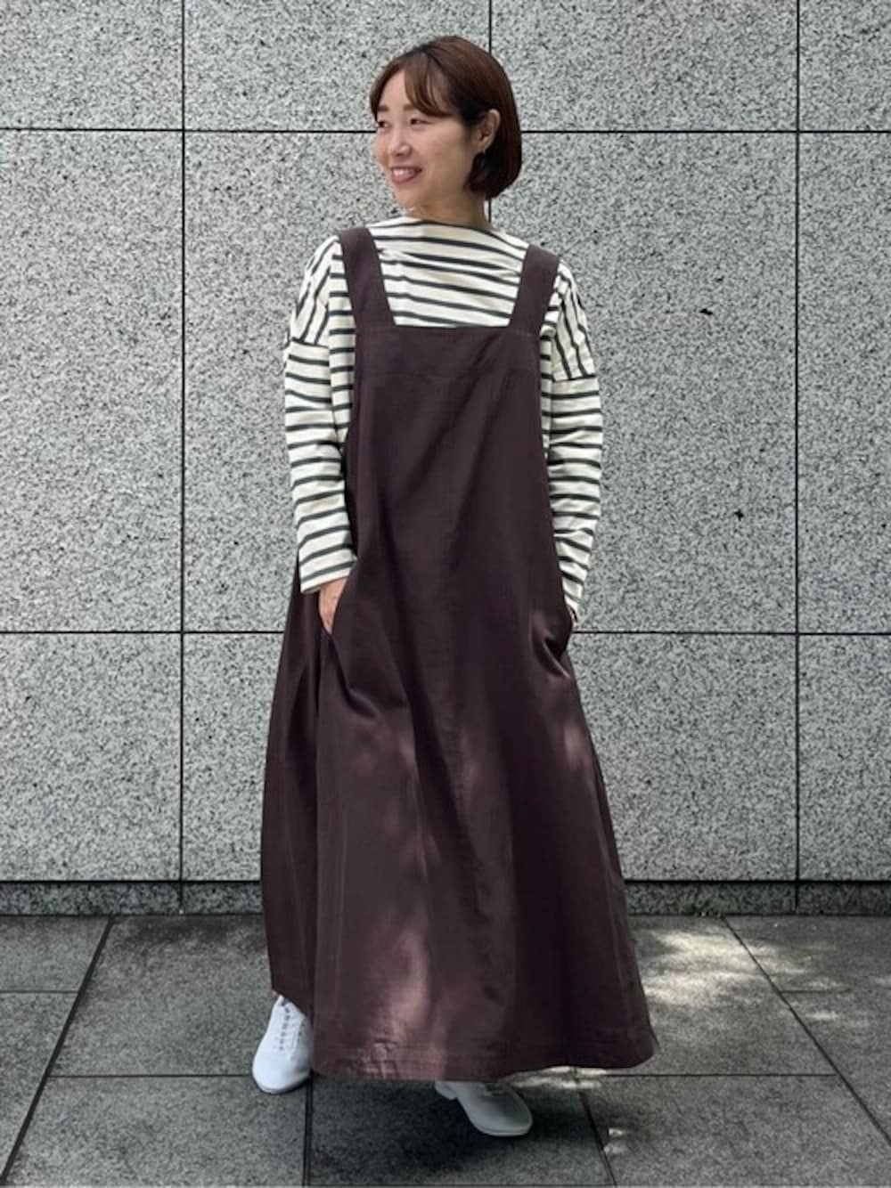 綿麻テンセルのナチュラルな落ち感があるジャンパースカート。 後ろだけコクーンシルエットになり、程よいボリューム感が楽しめます。 落ち着いたブラウンカラーが秋を感じるコーデに。