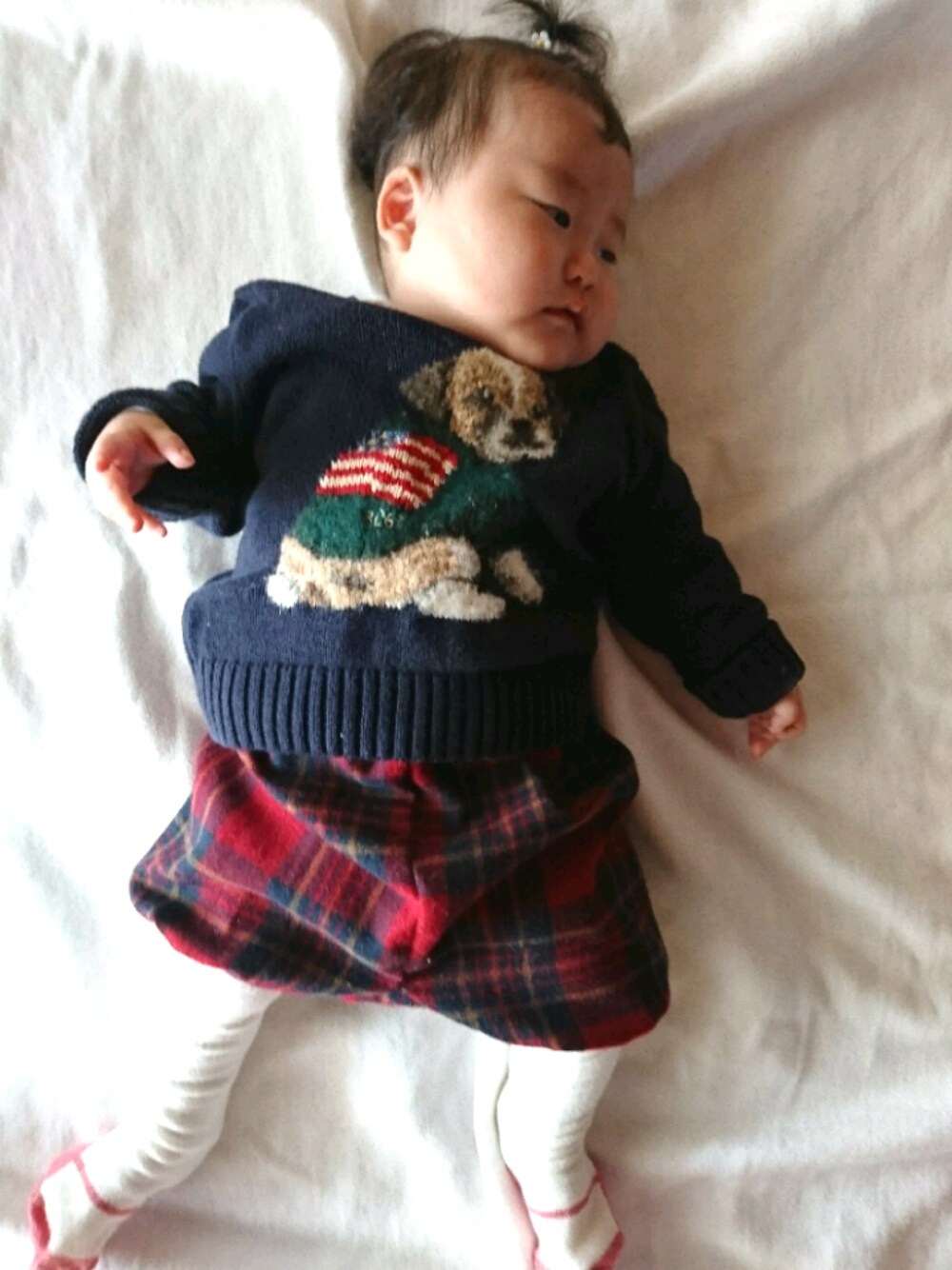 生後200日のちょっとした節目から娘ちゃんのコーデ記録始めます😀 実家に帰省したらめっちゃ寒くて冬支度☃️ お兄ちゃんのお下がりセーターにあわせてコーデしてみた!🤣💕 思いつきで小学生の家庭科知識で娘のかぼちゃパンツ作った♥️笑 かなり雑!💦 知識と技術が欲しい😂