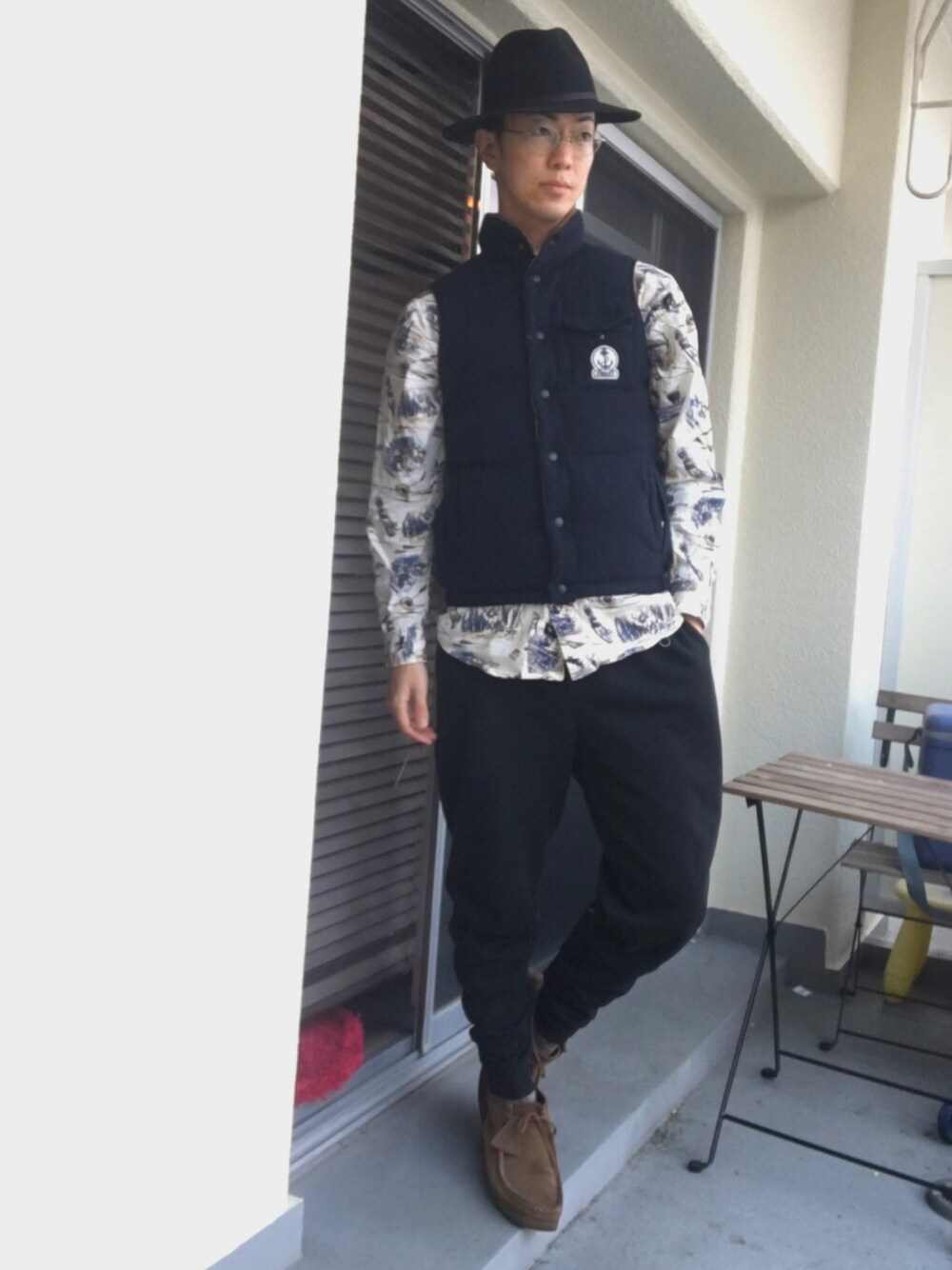 古着の柄シャツに紺のダウンベストで合わせた感じです☺︎