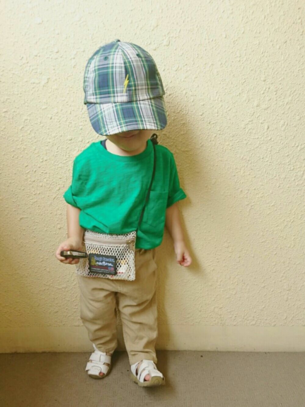 本日のコーデ👕 今からお友達に会いに👦♥ ◎鮮やかなグリーンのTシャツは一目惚れ👌❤パリッときれいなお色が真夏に映えますね🙆🙆120とかなり大きめを買ったので、袖はもちろんロールアップ⤴そして、パンツにイン☝☝ ◎タフトラベラーのサコッシュは、コンパクトサイズ➕ファスナーもしっかりしているので、息子ひとりでも出し入れができます🙆⤴(勝手にKEYくんの真似っこ❤) 今日はお友達に借りていたトミカを入れてます🚕🚕…ちゃんと返してね💨 ◎鮮やかなグリーンのTシャツに合わせて、パンツは麻混で少しくすんだカーキベージュに👖。最近よく転んで膝を擦りむくので、久しぶりにパンツスタイル☝☝ 息子くん、今日は転ばないよーに気を付けようね😌☀