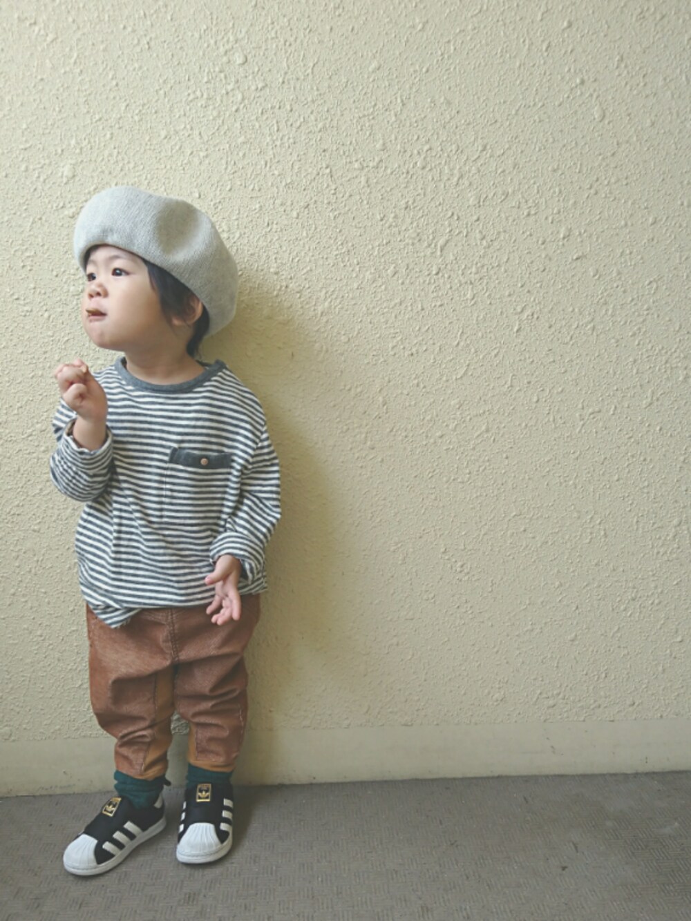 本日のコーデ👕 グレー✖キャメルで秋色コーデ🎨🍂 ← 🍪をつまみ食いの僕👦 ◎夏からずっと愛用のベレー帽は、素材的にそろそろお休みなのですが、このお色合わせやすくてついつい被せてしまう😁💨秋冬で同じカラー探そうかなぁ😔☝☝w ◎グレーの細ボーダーのロンTはZARAさん。プチプラですが、胸ポケ✖袖折り返しのデザインあり💃✨おチビは更に袖巻き巻きしてますが😁wオンラインで買ったのですが、使いやすくて店舗でブラウンレッド追加😆💕←ネットで見るよりタイプなお色だったので即決❤❤w ◎去年からのコーデュロイパンツも、合わせやすくてつい履いてしまう~😚グレー✖ベージュ系の組み合わせって、ナチュラルで優しい色合いで大好きです😌💕 今日は、近くで秋祭りがあるという情報を耳にしたので、あとでパパと3人で行ってみよー😊🍂大鍋振る舞いやキッズのお菓子巻き…など、結構大きなイベントのようなので楽しみ🌾🍂✨
