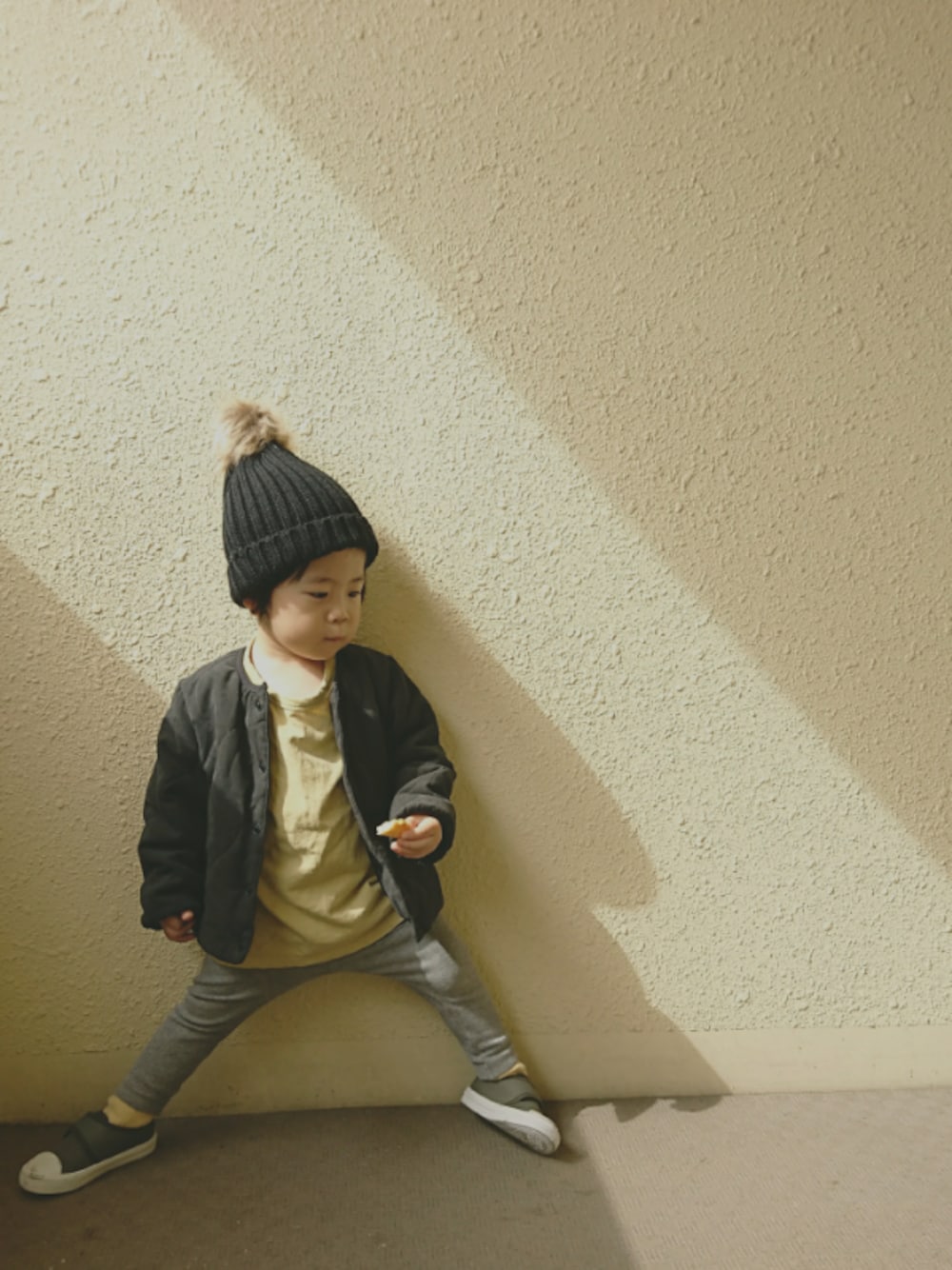 本日のコーデ👕 プチプラ~ 🙌 ちょっと背伸び。 2歳♂たまにはクールになりたいぞ…style👦💙 (🍘を頬張っていますが…ご愛嬌で✋w) ◎ボンボンが可愛い❤ブラックのニット帽は、ホワイトと2色買い👌。ブラックにボンボン…ほどよい可愛さもでて可愛いなぁ😍おチビには、まだまだ可愛さを求めてしまうBBAです 😁👍w ◎西松屋でgetしていたブルゾン✨ノーカラーのキルティングで、すっきり着やすい😌💕ブラックはあまり持っていなかったのですが、モノトーンって…インナーや小物の色味を引き立ててくれるのが素晴らしいな…と再確認です😊✨✨ この冬は、シンプルに黒が気になります❤ ◎インナーは、お気に入りmonmimiさん。この素敵色が際立つように、他はブラック系で抑えました😌やっぱり、このイエロー…素敵❤❤ ◎去年のUNIQLOのリブレギンスが、本格的にちょんちょん😆☝☝ウエストはジャストサイズ。このピタっと感を求めると80センチが好みなので、なかなか90を買い足せずにいるダメ母😁💨…いい加減買おうかな😔✋w 本日の大窓は、開脚の限界に挑戦している息子💪このあと、そのまま小股が床にチョーン😆💦w。ちょんちょんのレギンスが尚更寸足らずに見えます💦💦w ただ…羨ましいまでの柔らかさ😔✋