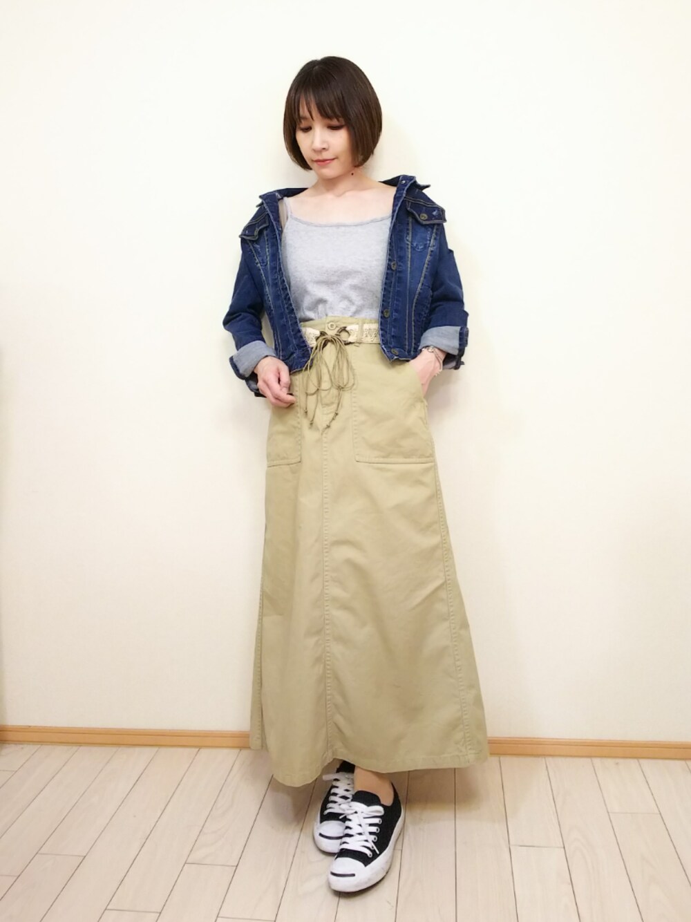おはようございます😃 本日はベイカーポケットロングスカートに、デニムジャケットをあわせました🌟 足元はコンバース👟カジュアルコーデです🎵