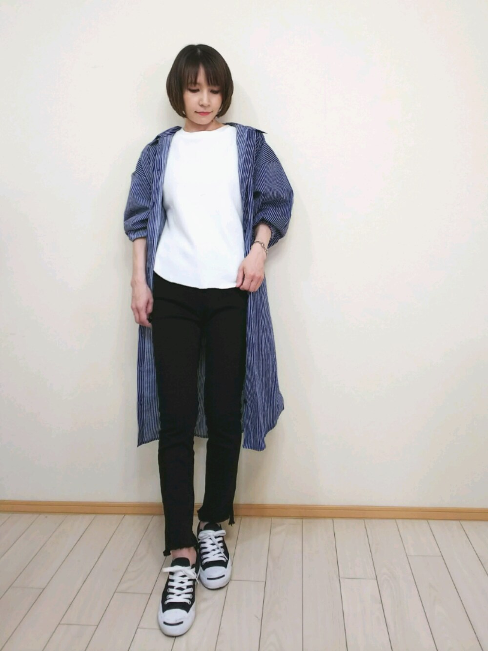おはようございます😃 昨日、今日は良いお天気ですね👍 でも、気温差がありすぎて、着るもの選びが大変です💦 アイラブメンズライクの影響で、本日もかなりボーイッシュなコーデ🎵 白のカットソーに、ストライプのワンピースを羽織ってカーディガン風に🎵 黒スキニーにコンバース👟です🎶