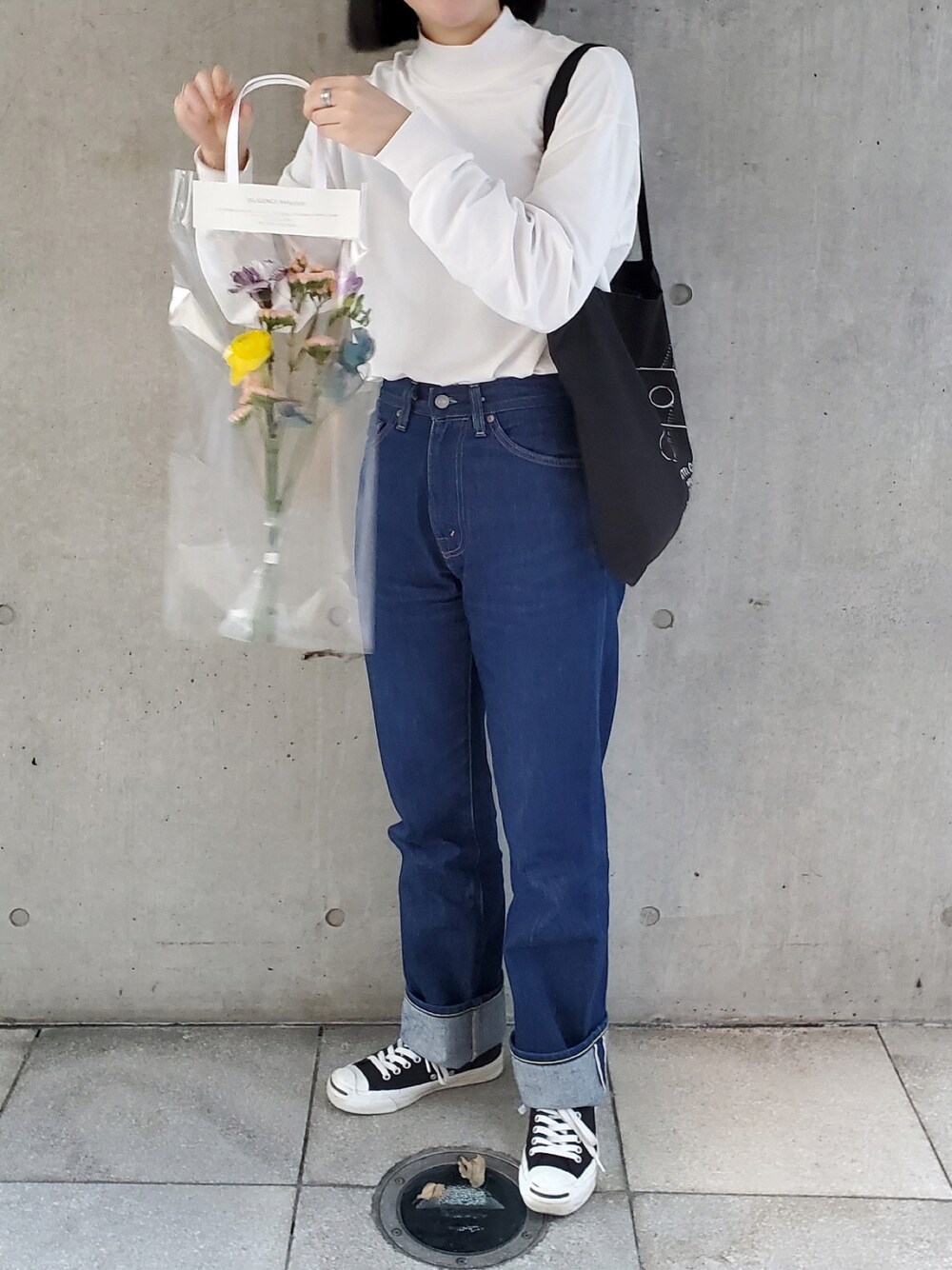 暖かかったのでシンプルなコーデ 夜はライダース羽織ってました