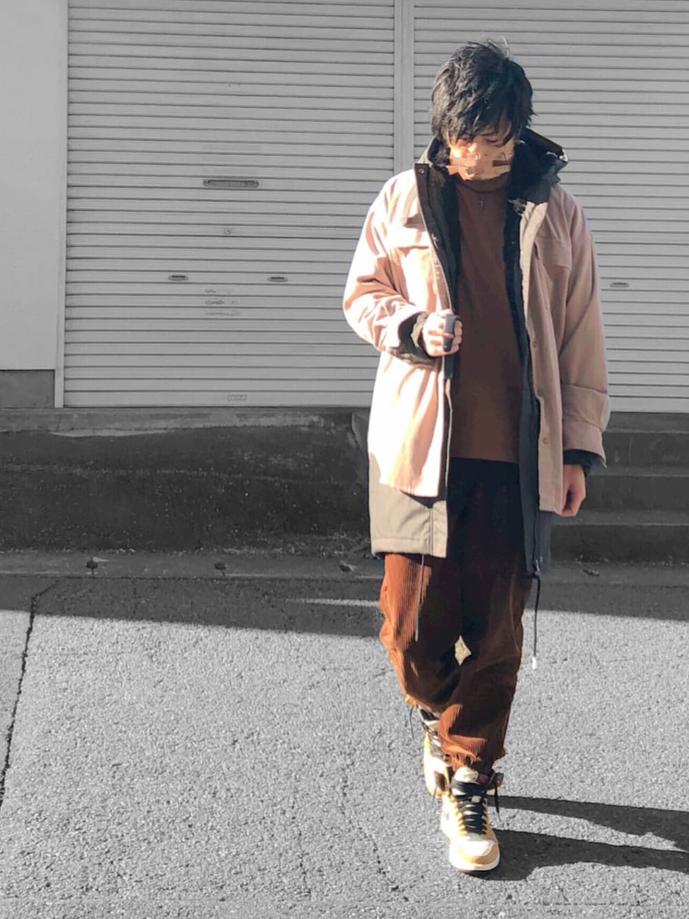 TOPS:H&M GU PANTS:GU FOOT:NIKE aj1 冬アウター着回しチャレンジ③ コーデュロイ✖️コーデュロイ ピンクのコーデュロイシャツにブラウンのコーデュロイパンツ