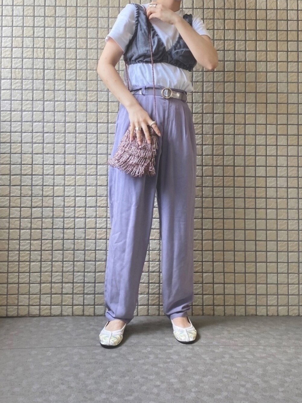 バック掛け直してる瞬間ショット。フリンジの揺れが絶妙。ZARAのセールアイテムです◎◎ おばあちゃんにもらったパンツ丈が長いけど、とろんとしたシルエットが好き〜。