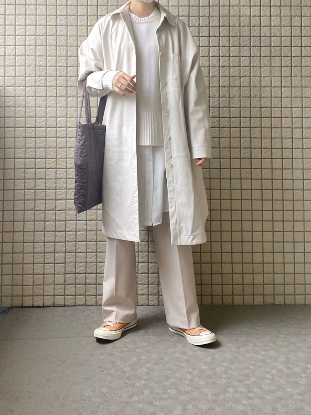 オフホワイトワントーン+秋っぽく足元はオレンジ🍊 メンズライクなシルエットでも、女の子らしいカラーでバランスを◎◎