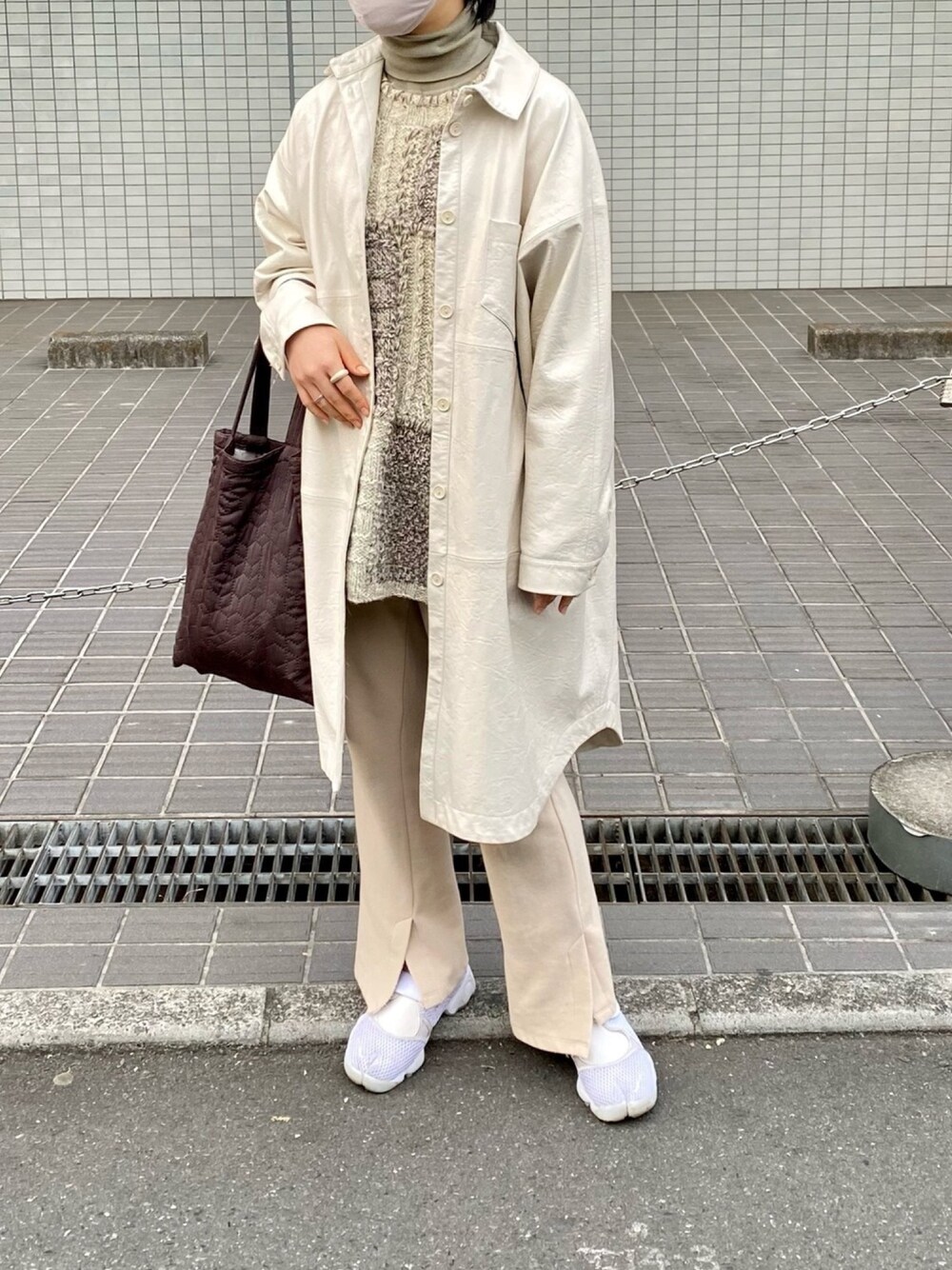 オフホワイトワントーン🤍 ニットは古着でよくみるとケーブル柄なのが可愛い〜。