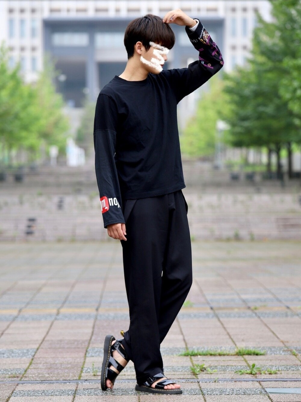 オールブラックコーデ😎 ご覧いただきありがとうございます! いいね、お気に入り、フォローして下さったら 更新のモチベーションになるので良かったらお願いします!! 今日もオールブラック🤣 ロゴが可愛い過ぎるんです!! 全体的にIラインシルエットを 意識してまとめてみました🤤 《サイズ》 ロンT L パンツ 2 サンダル 27.0