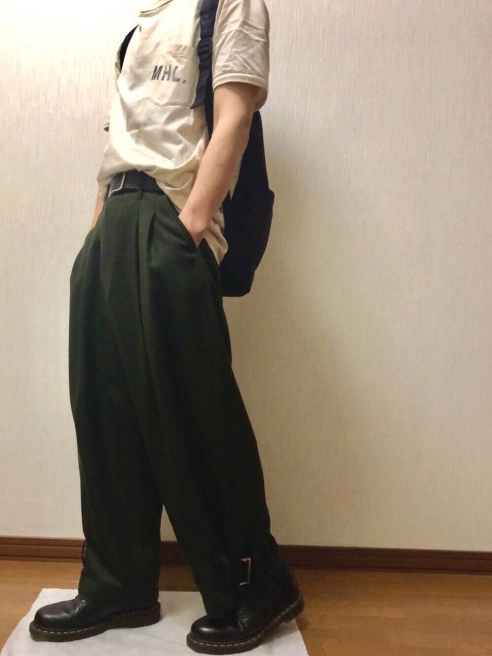 昨日はお遣いで外出したら、にわか雨でびっしょりになりました。 早くもGW最終日ですね。 時間見つけてクリアしようとしてたFF7Rは終わらずでした… 【アイテム】 トップス:MHLロゴT ボトムス:ZUCCAウールサキソニー シューズ:ドクターマーチン リュック:ZUCCA タックインが似合わな過ぎると酷評されるのですが、深めのツータックでドレープがめっちゃ綺麗なのでめげずにフロントだけインしてみる。 スーツとか普通なのに私服でやるといまいちなのは、選び方下手過ぎるせいなのか… 裾のベルトでシルエット変えられるバルーンっぽいパンツなのですが、よく話しかけられる作業着屋のおじちゃんにニッカポッカって言われました。笑 お洒落ニッカポッカです!って言っておいた。