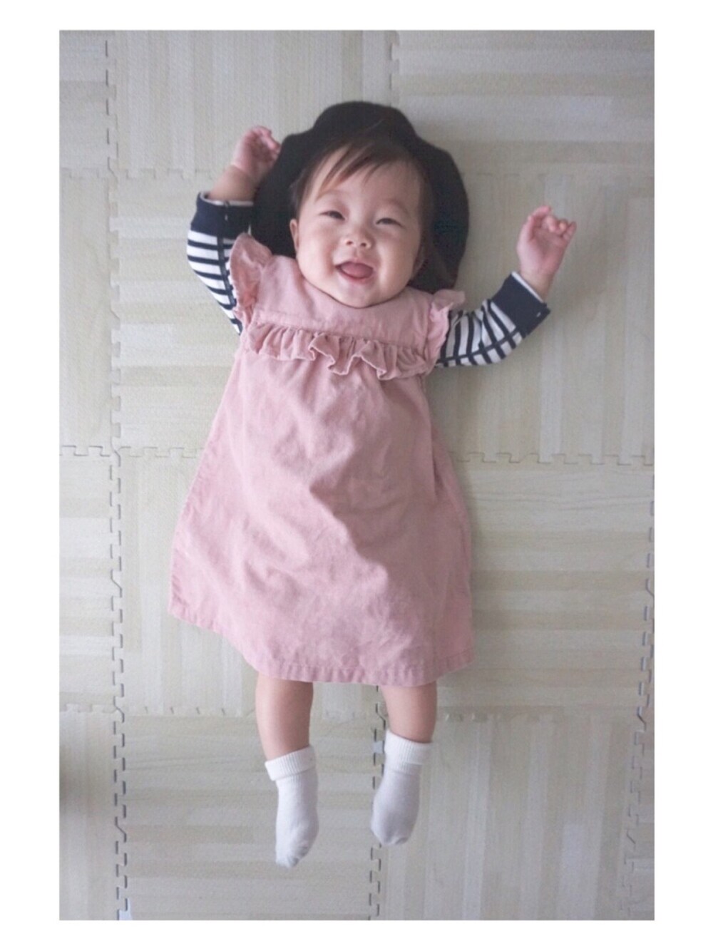 お友達のお家へ✯ いつもより少しおめかし♡ ワンピもベレーも大きいね😅 そしてボーダーのロンパース表裏逆だ😂🙏💦笑