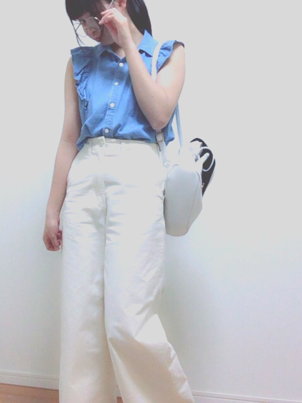 ホワイト系のパンツ、ホワイト系のバッグを着用したレディースの春コーディネートの1枚目の写真