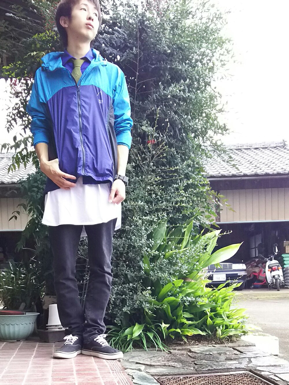 雨の日はスポーティーな気分になります! インナーをシャツとネクタイでかっこよさも