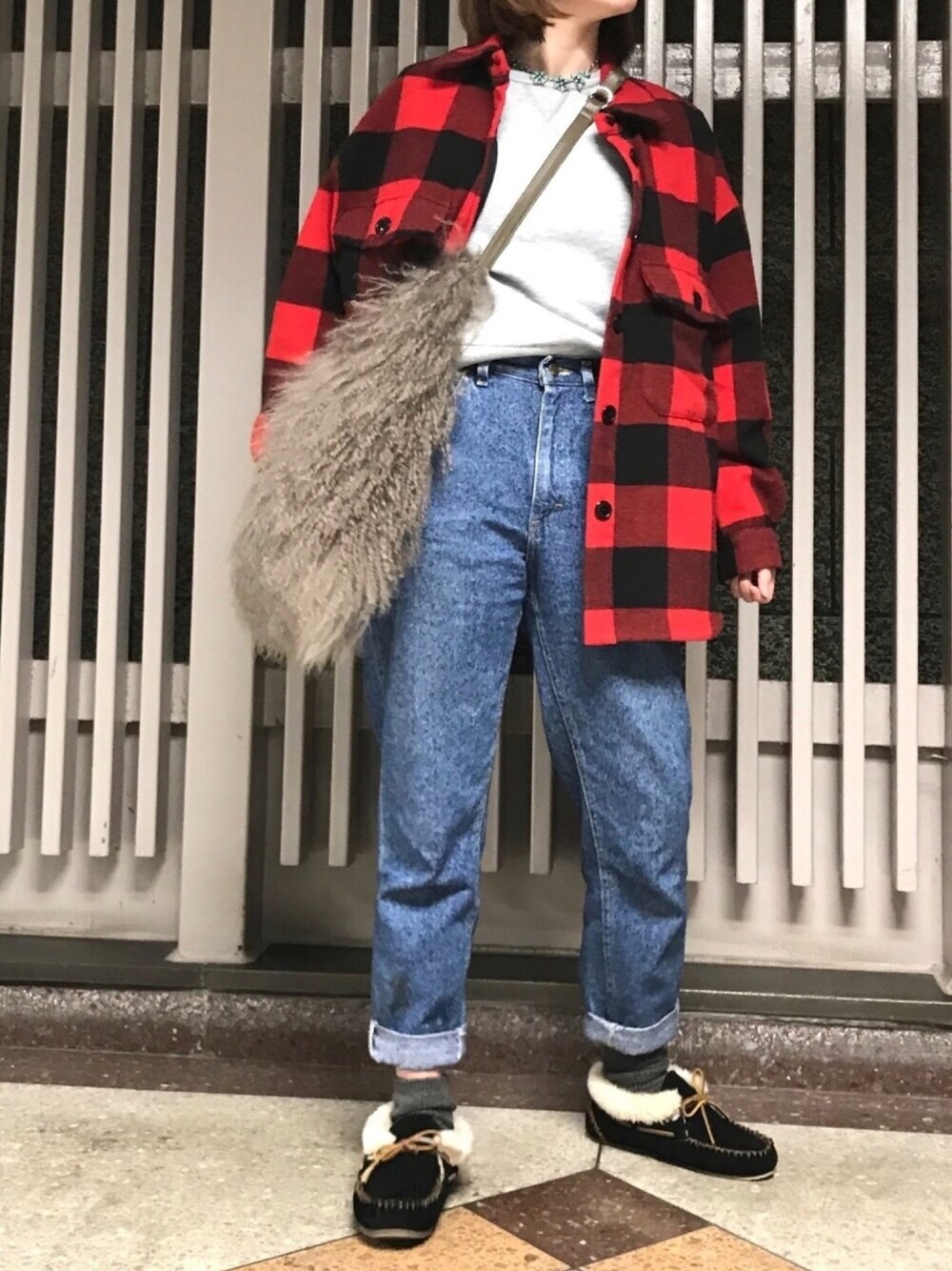 シンプルなスウェットには大きめのアクセサリーで。 Leeのvintageママデニムはお気に入り。 ウエストマークした方が可愛く着られるけど! ミネトンカのボアシューズも、深いのと浅いのがあって、こちらは深いのだから、なんなら裸足でもその辺ならいけるので、良いです。