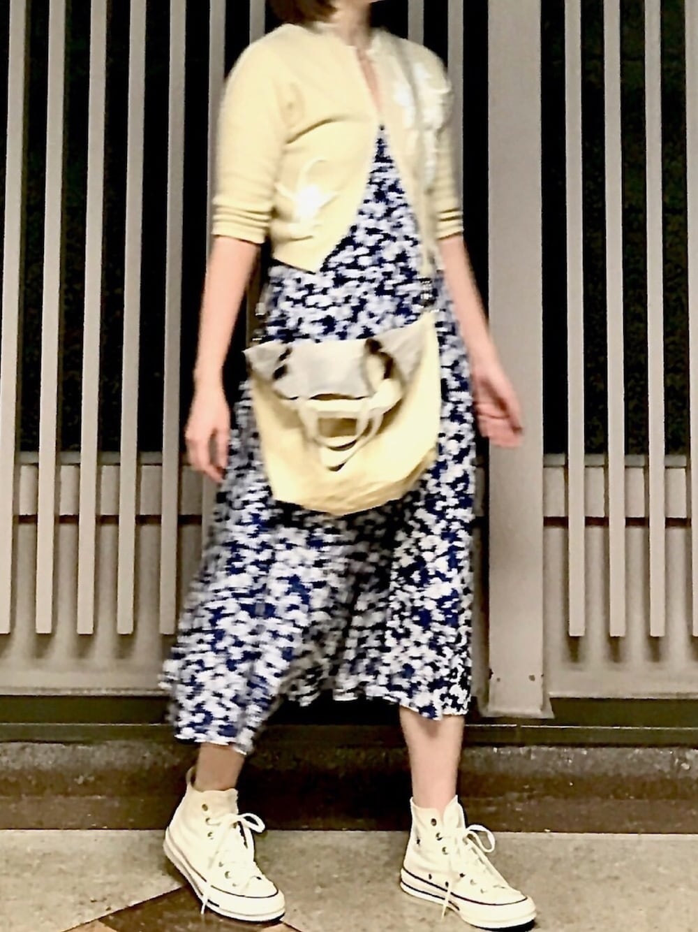 花柄のワンピはメルカリ出品中。 ヴィンテージのビーズカーデはかなりジャストサイズなものを探して、一枚又は薄手に羽織るくらいで着たくて。 袖丈も丁度いいかんじだし、クリームのニットと白のビーズのコントラストが好き。