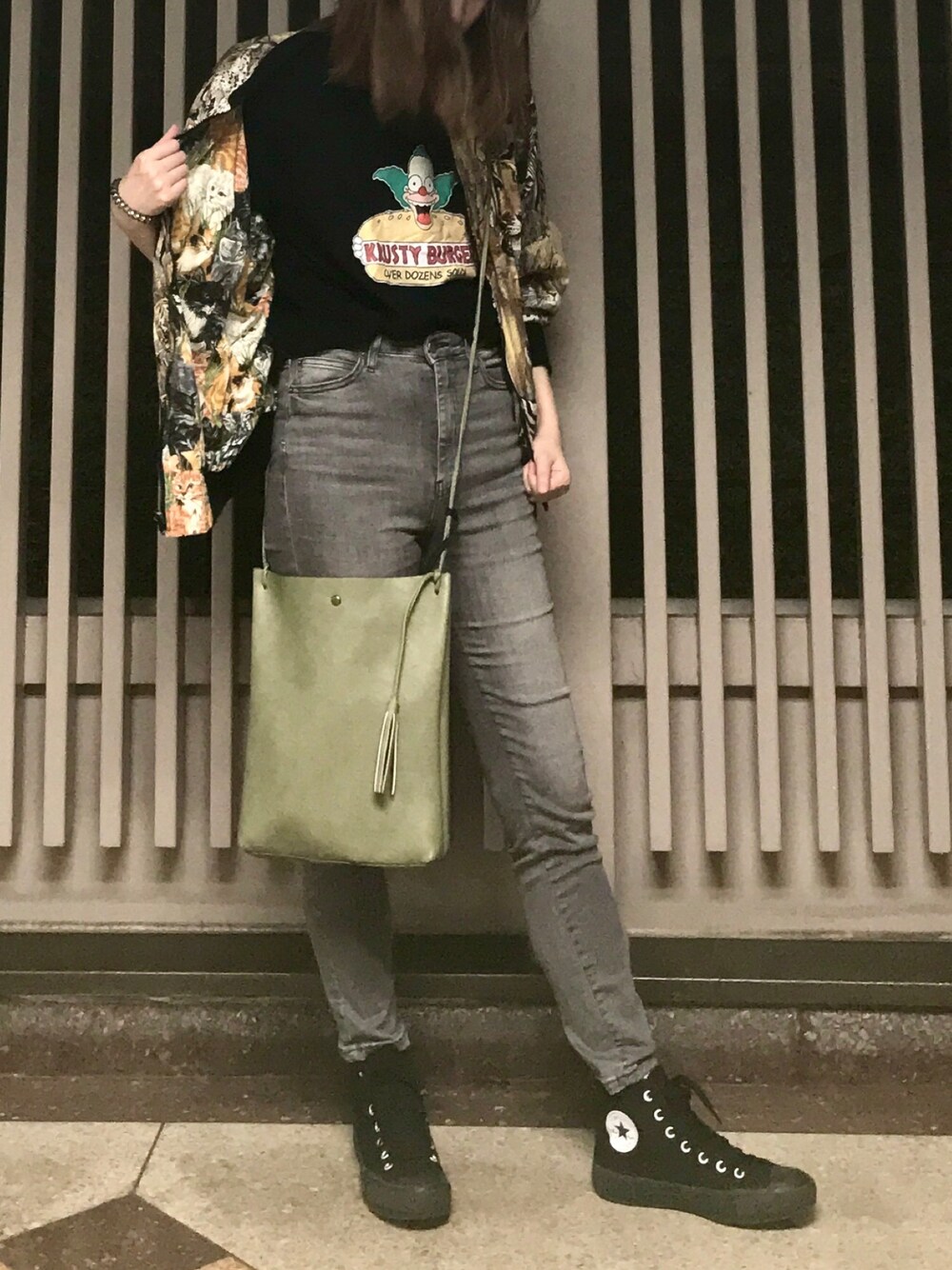 Amazonで買った#Simpsons の #Tシャツ 昨日は突然の雨だったので#goatex のコンバースで助かった。 古着のブルゾンはリバーシブルで、外側は#百獣の王 たち。中は#猫 ちゃん #シンプソンズ