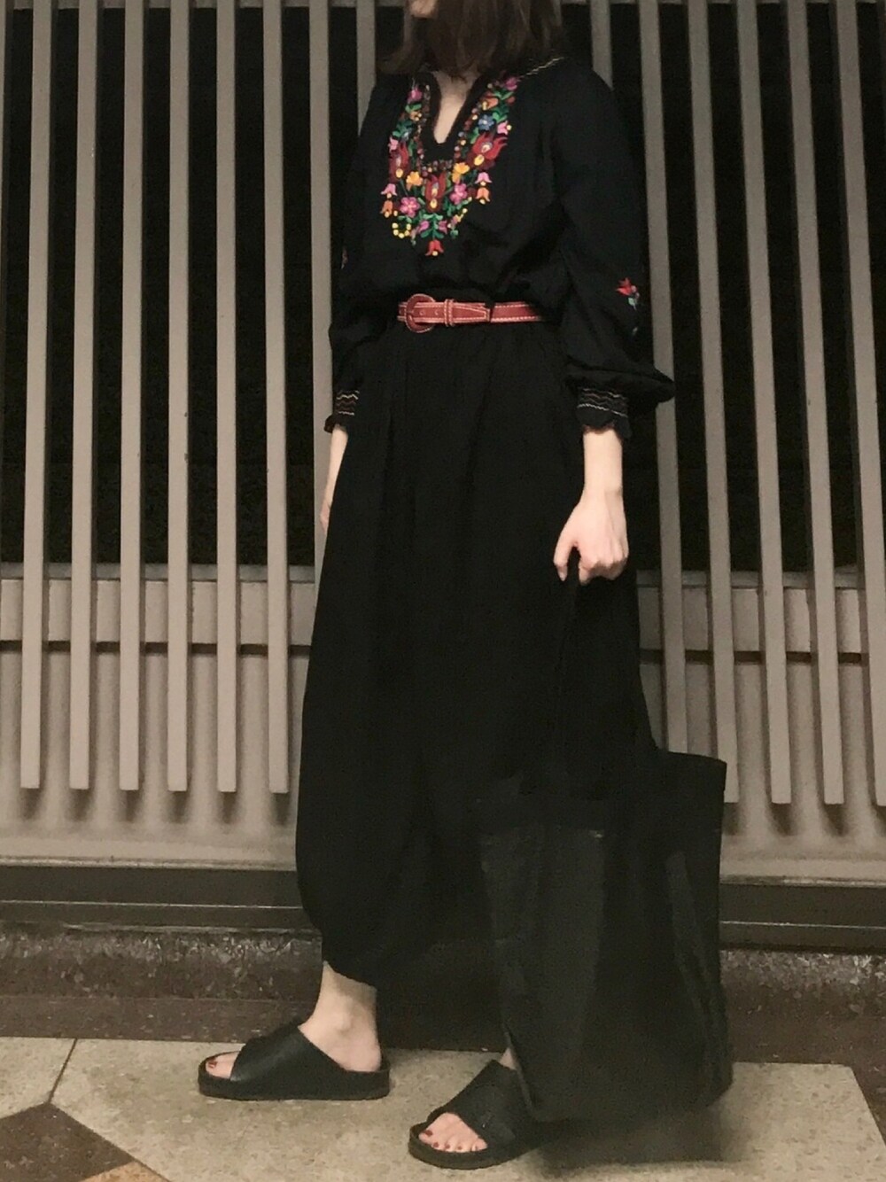 サーカスパンツは楽でいい。 ヴィンテージの刺繍ブラウスはお気に入り。