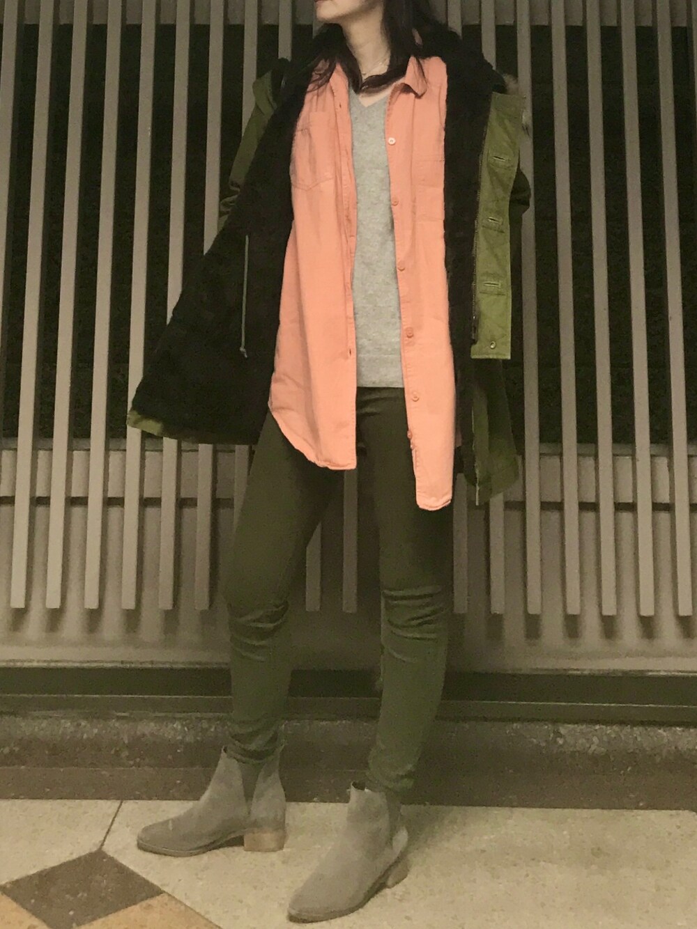 HONEY LEMON PIEのシャツ/ブラウス「後ろが可愛いサーモンピンクのヴィンテージシャツ」を使ったコーディネート