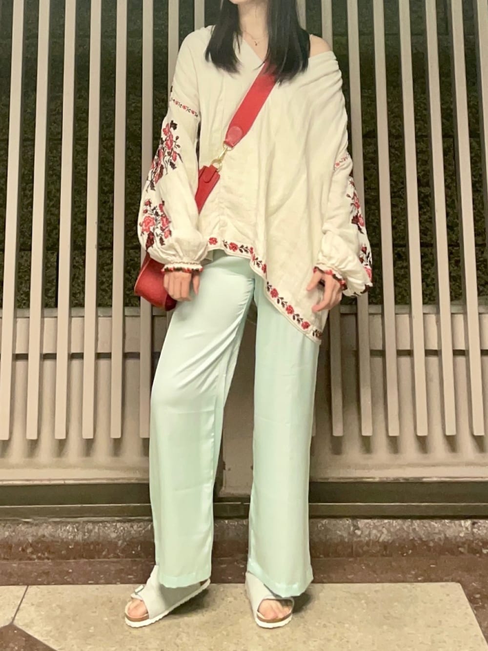 ミントグリーンのサテンパンツとヴィンテージウクライナ刺繍のトップス ミントグリーンに赤の差し色。