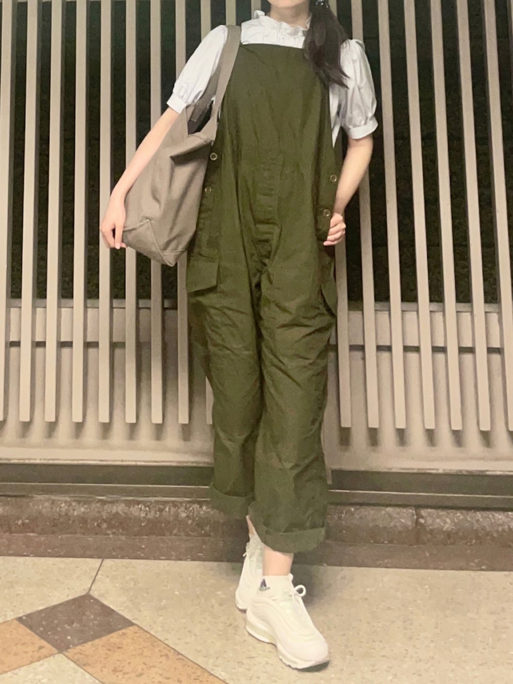 フリルネックブラウスと軍もののパラフィン加工サロペットで甘辛。