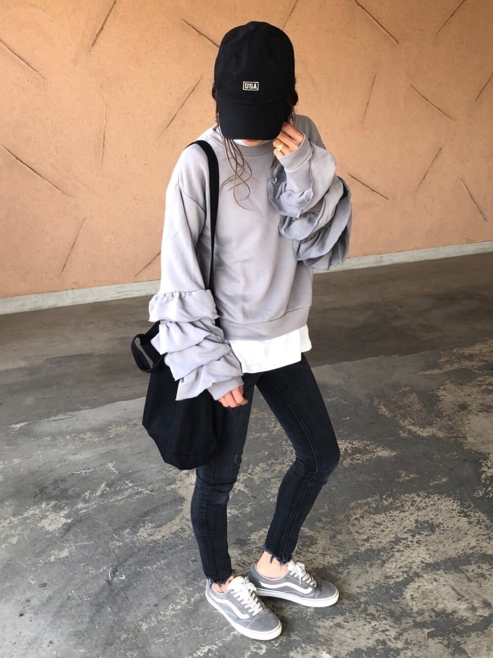 袖がフリルになったトレーナーを、 モノトーンでカジュアルに♡ ◆Instagram◆ COPINE→@copine_ayaiku 私→@ayayayark