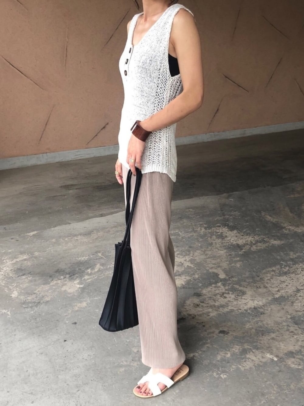 プリーツパンツに、 ざっくりノースリーブ合わせて、 ゆるコーデ♡ バッグはプリーツバッグ。 小物から秋を意識♡ ◆Instagram◆ COPINE→@copine_ayaiku 私→@ayayayark