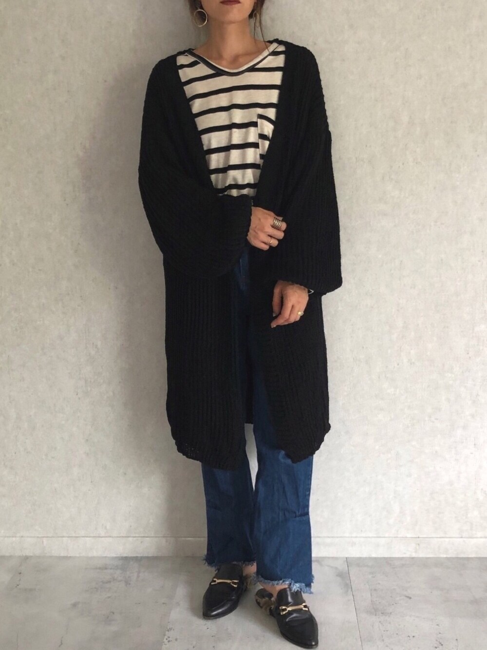 ビッグシルエットのボーダーのロンtは、 デニムにinして、 ニットカーディガンとのバランスを。 ブラックワントーンコーデ♡ ◾️Instagram COPINE→@copine_ayaiku 私→@ayayayark