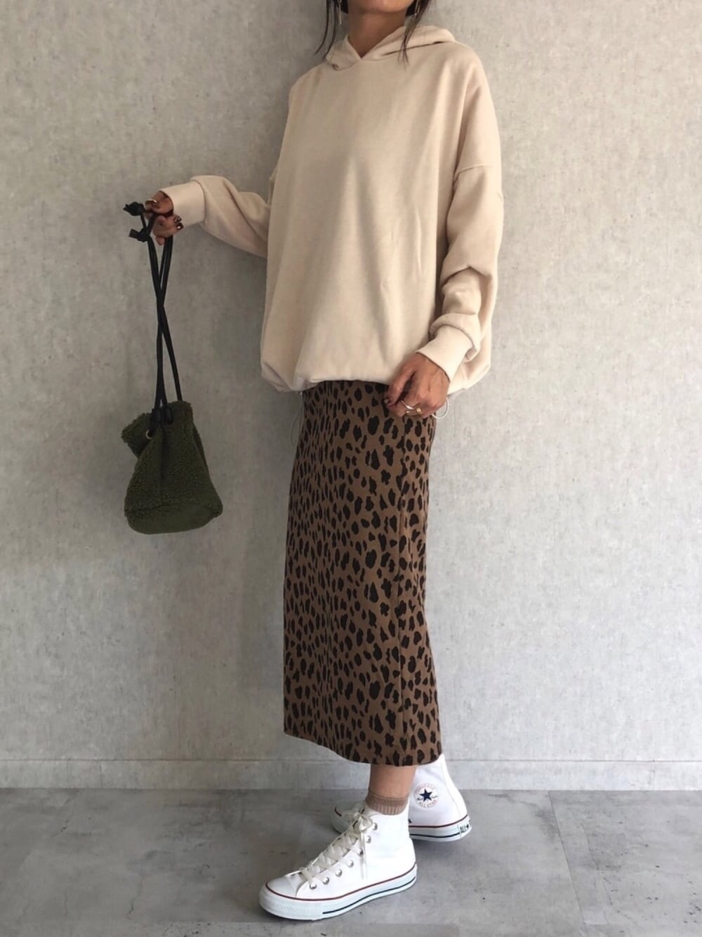 レオパードスカートに、 オーバーサイズなパーカーとスニーカー。 カジュアルスカートスタイル♡ 裏起毛のあったかパーカーは、 オーバーサイズだけど、 裾が絞れて長さ調節可能😊 ◾️Instagram COPINE→@copine_ayaiku 私→@ayayayark