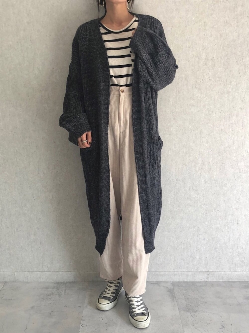 ゆるっとケーブル編みニットカーディガンに、ゆるっとコーデュロイパンツ😊 ホワイト×グレーコーデのゆるコーデ♡ ◾️Instagram COPINE→@copine_ayaiku 私→@ayayayark