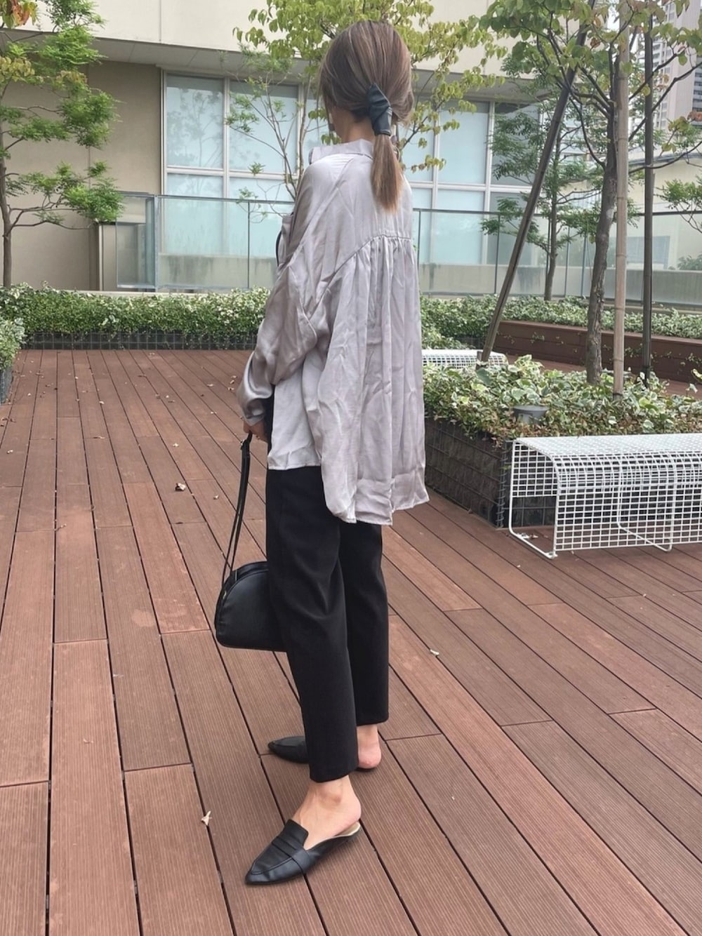 ayaのシャツ/ブラウス「バックギャザーデザインサテンビッグシャツ(2color)」を使ったコーディネート