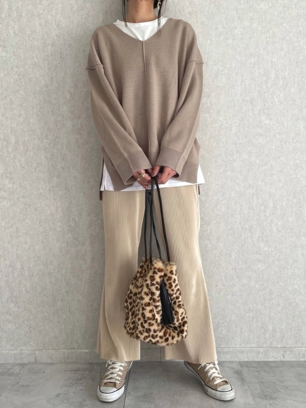 ゆるっとトップスに、 ゆるっとプリーツパンツの、 ベージュワントーン楽ちんコーデ♡ アクセントにレオパードバッグ♡ ◾️Instagram COPINE→@copine_ayaiku 私→@ayayayark