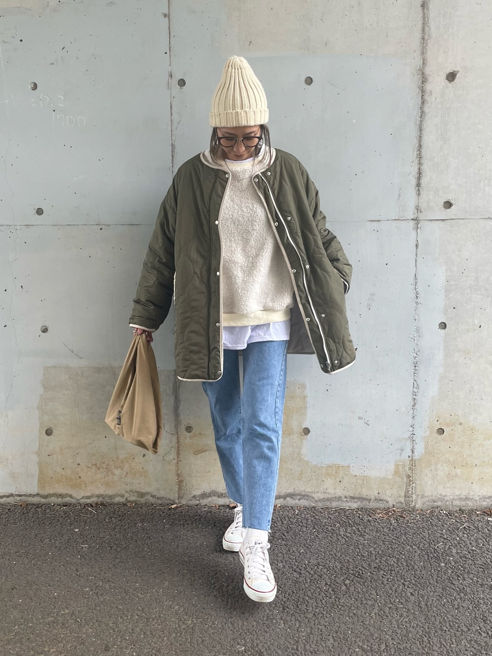 アイボリー×カーキのリバーシブルコート♡ レイヤード風なボアトレーナーに デニム×スニーカーでカジュアルに😊 ◾️Instagram COPINE→@copine_ayaiku 私→@ayayayark