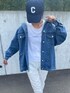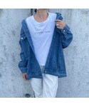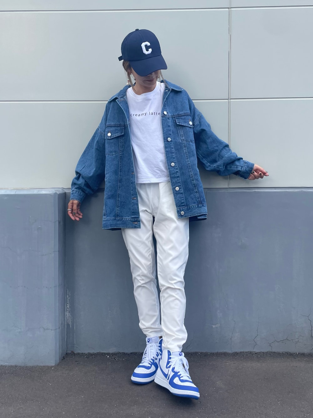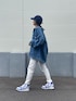 楽ちんテーパードパンツに、 オーバーサイズデニムジャケット合わせた カジュアルスタイル😌 ホワイト×ブルーコーデ♡ キャップの大きなロゴがポイント✨ ▪️Instagram COPINE→@copine_ayaiku 私→@ayayayark