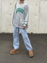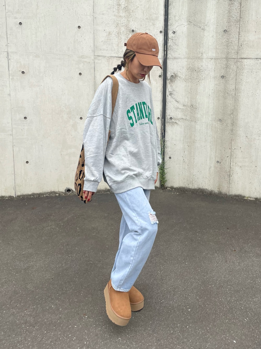 ゆったりオーバーサイズロゴスウェットに、 ゆるダメージデニムを合わせたゆるコーデ♡ 小物はブラウン系で統一😊 ▪️Instagram COPINE→@copine_ayaiku 私→@ayayayark